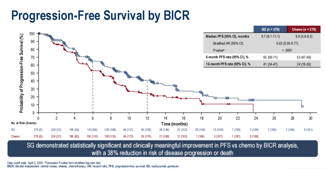 研究结果显示,主要终点:BICR评估SG组的中位PFS相较于化疗组延长2.8个月,疾病进展或死亡风险显著降低38%(9.7 vs 6.9个月,HR 0.62,95%CI:0.50-0.77,P<0.0001),各个亚组均呈现一致的获益趋势。