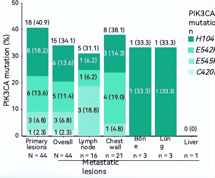 在本研究中,共纳入44例激素受体阳性、HER2阴性乳腺癌中国患者,并分析了其原发灶及转移灶的PIK3CA突变分布及热点突变位点。结果显示,原发灶中检测到PIK3CA突变的病例有18例,占比40.9%;而转移灶中检测到突变的病例为15例,占34.1%。各位点突变分布方面,H1047R为最常见的突变热点,在原发灶中占18.2%(8例),在转移灶中为13.6%(6例);E542K突变在原发灶和转移灶的比例分别为13.6%(6例)和11.4%(5例);E545K突变分别为6.8%(3例和3例)。此外,在骨、肺等不同部位的转移灶中,PIK3CA突变率分布在31.1%到38.1%之间,单例肝转移未检测到突变。上述数据表明,PIK3CA突变在本研究人群中的发生率较高,且热点突变以H1047R、E542K和E545K为主,提示针对该基因的分子检测在临床具有较大的价值。