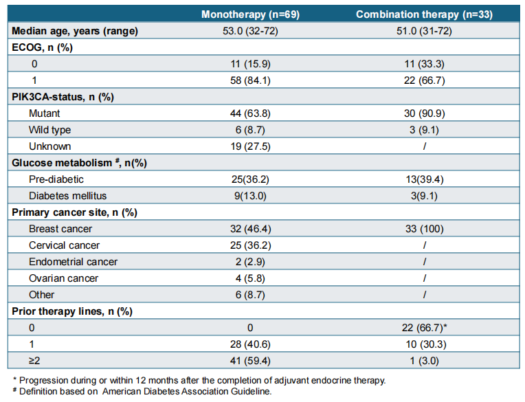 截至2025年5月30日,69例患者被纳入单药治疗研究。其中44例(63.8%)患者存在PIK3CA突变;41例(59.4%)患者既往接受过≥2线治疗。截至2025年8月19日,联合治疗研究入组33例患者,其中30例(90.9%)患者存在PIK3CA突变;22例(66.7%)患者除辅助内分泌治疗外,既往未接受过任何系统性抗肿瘤治疗。此外,两项研究中,均有近50%的患者合并糖尿病或糖尿病前期。