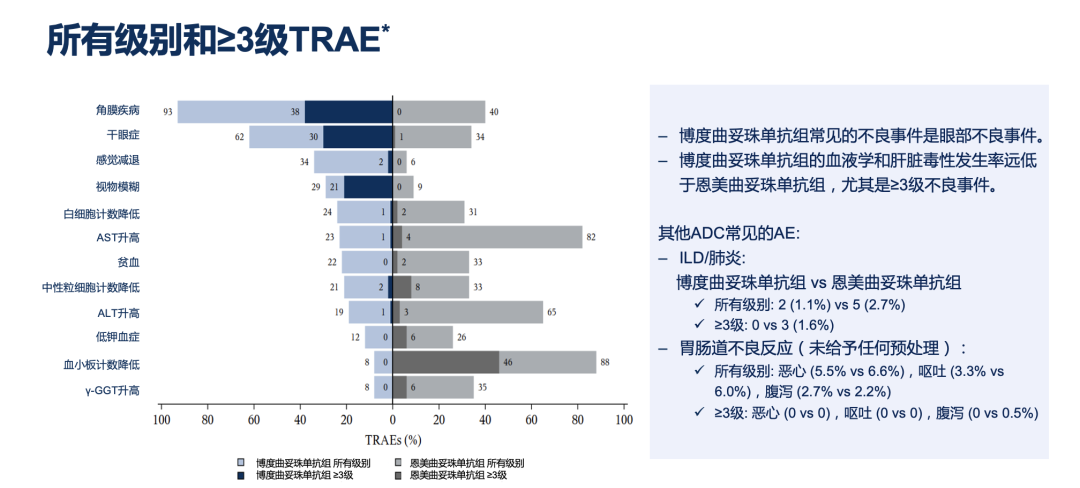 骨髓抑制是传统化疗及部分ADC难以回避的问题,常伴随中性粒细胞下降、血小板减少,增加感染与出血风险,甚至导致治疗中断。而sac-TMT在临床研究中显示出较轻的骨髓抑制程度,≥3级中性粒细胞减少和血小板减少发生率低于传统化疗,有助于患者维持相对稳定的血象水平,保障治疗连续性。