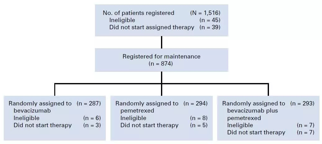 1. 患者特点:从2010年8月至2015年4月,共计1516例患者进行入组筛选,分别有42%和86%的患者为男性和白人患者,中位年龄64岁,其中92%的患者为IV期,17%的患者有脑转移。经过诱导治疗后,874例(57%)的患者随机接受维持治疗,其中男性和白人比例分别为49%和87%。在α=0.025的水准上,三组患者的临床病理特点无显著差异。入组过程如图1。