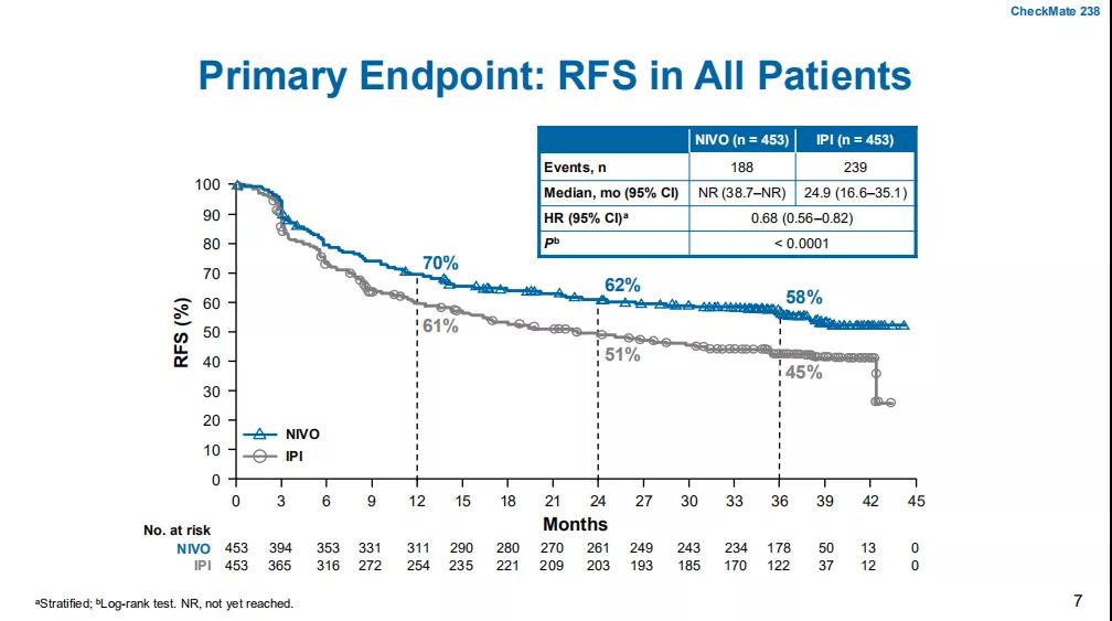 2017年底,PD-1单抗,包括纳武单抗和帕博利珠单抗,相继被批准用于术后Ⅲ期和Ⅳ期的黑色素瘤的辅助治疗。这标志着黑色素瘤正式迈入了辅助免疫治疗时代。但当时被批准时仅有1年的RFS率,也被广大学者所诟病。今年ESMO会议推出了CheckMate238研究(纳武单抗据此研究被批准)的3年数据更新。