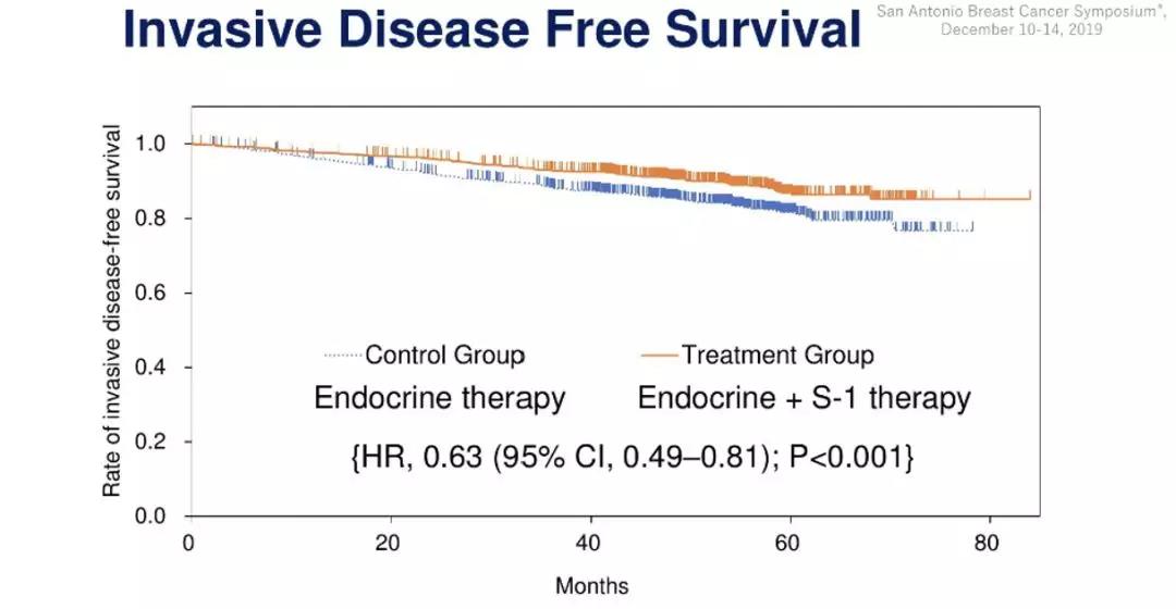 结论:术后辅助应用口服氟嘧啶S-1联合标准内分泌治疗,可显著降低HR+/HER2-乳腺癌患者的iDFS事件,并提高5年iDFS率,具有可行的安全性。