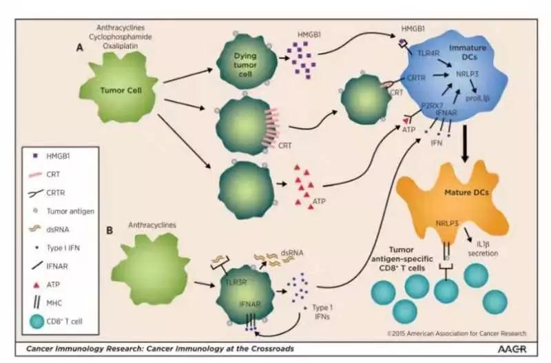 原理一:肿瘤细胞受化疗药物杀伤后大量释放HMGB1(高迁移率族蛋白B1)、CRT(钙网蛋白)、ATP(自噬信号蛋白);另外,受蒽环类药物杀伤的肿瘤细胞产生dsRNA,反作用于瘤细胞,促进IF-10(type1型)分泌,这些因子诱导DCs(树突细胞)成熟为NRLP3(炎性小体)并分泌IL-1B促使CD8+T细胞成熟进而参与肿瘤细胞免疫过程,杀伤肿瘤细胞。