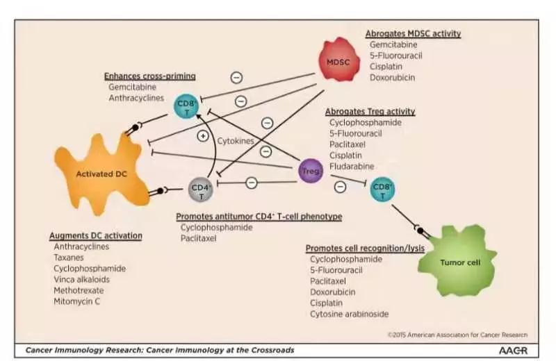 原理二:多种化疗药物如蒽环、铂类、吉西他滨、5-氟尿嘧啶等均可抑制MDSC(骨髓来源抑制细胞)与Tregs功能,从而增强CD4+、CD8+T细胞活性,分泌共刺激因子B7-1和B7-2,增强DC细胞的抗原呈递并能同时下调IC如PD-L1的表达,从而识别并杀伤肿瘤细胞。