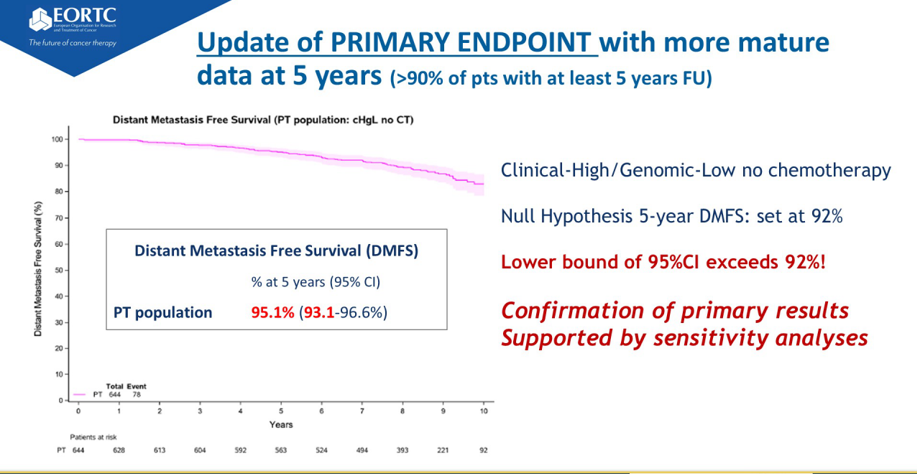 因此,作为一项治疗降级研究,MINDACT研究预设的主要终点是在临床高风险、MammaPrint低风险(cH/gL)的这组患者中,不接受化疗的5年DMFS率达到92%以上。2016年的中位初次分析显示这组患者的5年DMFS率为94.7%。这次中位随访8.7年的二次分析中,有90%的患者至少随访5年,70%的患者至少随访8年,结果看到5年DMFS率高达95.1%,已经远远超过了我们预设的阈值。