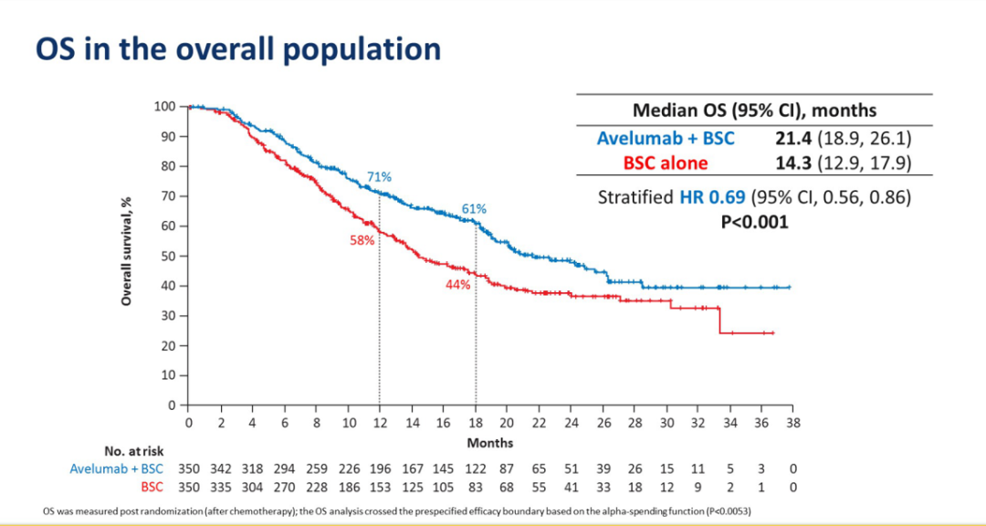 这项研究共入组了700例患者。相较于单独的最佳支持治疗(BSC),阿维鲁单抗+BSC维持治疗可显著可显著降低31%的死亡风险(OS:21.4 vs 14.3个月;HR 0.69;95%CI 0.56~0.86;P=0.0005)。PD-L1阳性的亚组患者OS也可显著获益(NR vs 17.1个月;HR 0.56;95%CI 0.40~0.79;P=0.0003);对于不同年龄和ECOG评分、不同化疗方案、是否存在内脏转移、不同肾功能(CrCl≥或<60mL/min)等不同亚组均可以看到OS获益趋势。在药物安全方面,绝大多数患者表现良好,仅有12%的患者因不良事件而中断用药。