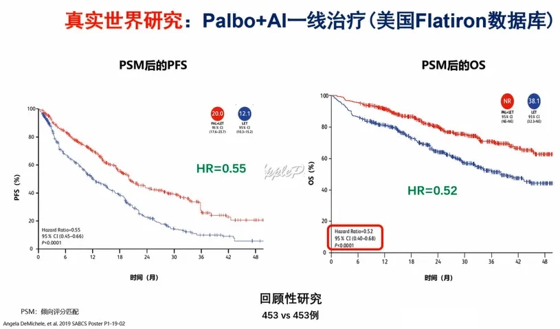 哌柏西利上市已经有5年,积累了大量真实世界的数据。一项基于美国Flatiron健康分析数据库的研究显示,哌柏西利在真实世界中的PFS与临床试验一致,并能显著延长中位OS,HR为0.52,达到了统计学差异(图2)。