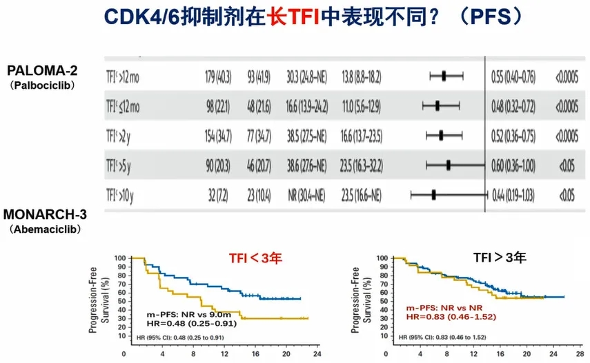 治疗间隔对CDK4/6抑制剂疗效的影响:PALOMA-2研究中,无治疗间隔时间(TFI)对哌柏西利的疗效似乎没有影响,不管TFI<1年,TFI>2年,TFI>5年,甚至TFI>10年,PFS的HR值都非常相近。而Abemaciclib对TFI<3年的患者有优势,对TFI>3年的患者似乎不存在优势(图4)。