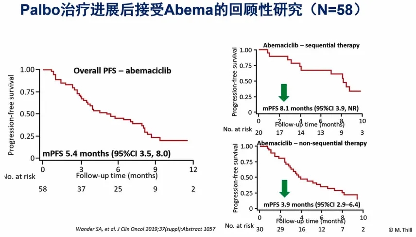 Wander SA, et al发表于JCO的一项对58例哌柏西利耐药后使用Abemaciclib治疗的回顾性分析显示(图5),Abemaciclib获得了5.4个月的PFS,其中,哌柏西利耐药后紧接着使用Abemaciclib,患者可获得8.1个月的PFS获益,否则只有3.9个月的PFS。为什么会产生这样的差异?有研究者认为CDK9的继发性升高是哌柏西利耐药的原因,而CDK9正是Abemaciclib的其中一个靶点。