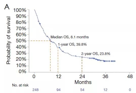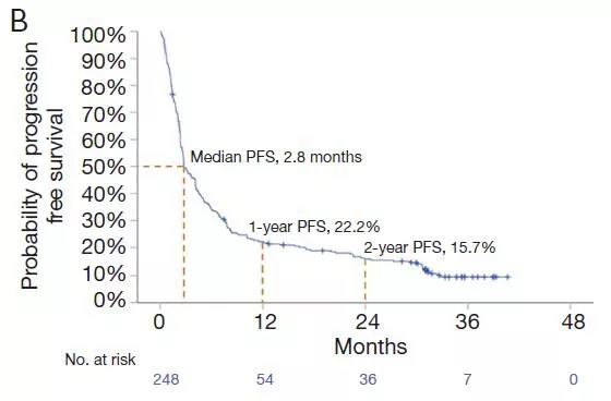 全组患者的中位OS为8.1个月,1年、2年及3年OS率分别为39.8%、23.8%和17.1%(图1)。中位PFS为2.8个月,1年、2年和3年PFS率分别为22.2%、15.7%和9.0%(图2)。