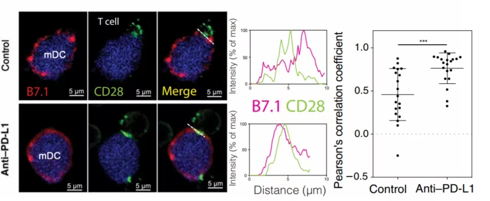 图2. PD-L1抗体封闭后,B7.1(mDC)和CD28(Tcell)作用增强