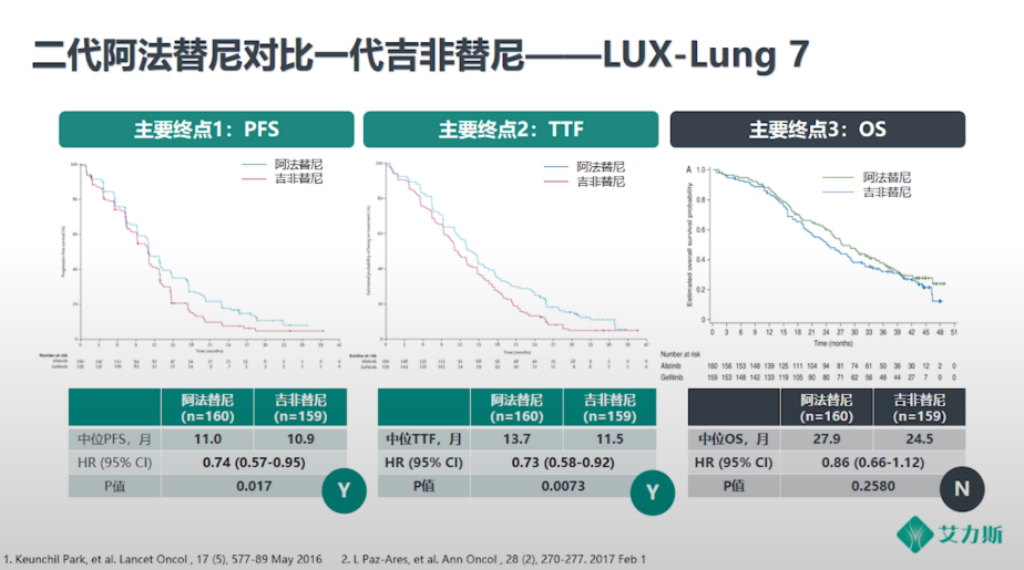相较于欧美人群,EGFR突变是中国肺癌最常见的驱动基因,几乎占到一半,所以EGFR TKI的探索与应用至关重要。在精准治疗时代以前,对于未筛选的肺癌患者,一代EGFR TKI获益有限,PFS仅3个月左右;随着EGFR突变人群筛选的应用,精准治疗时代真正开启,一代EGFR TKI对此类人群的PFS获益提高到接近1年。