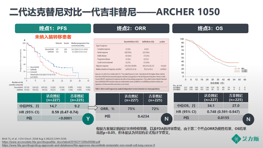 由于T790M突变造成一代EGFR TKI耐药,所以二代EGFR TKI引入了丙烯酰胺键,通过共价键与EGFR不可逆结合,相应的对T790M的抑制作用增强,但选择性较差,因此限制了其应用。LUX-Lung7研究显示,对于EGFR阳性患者,阿法替尼较吉非替尼延长了患者的mPFS(11.0个月vs 10.9个月)、mTTF(13.7个月 vs 11.5个月),但延长的绝对值有限,且OS无显著差异。ARCHER 1050研究则对另一个二代EGFR TKI达克替尼进行了探索,相较于吉非替尼,达克替尼的mPFS(14.7个月 vs 9.2个月)、OS(34.1个月 vs 27.0个月)有显著改善,然而该研究方案规定了固定次序的检验策略,OS前序终点ORR无统计学差异,所以不能认为OS具备正式的统计学意义。在二代EGFR TKI疗效改善并不明显的同时,其不良反应有明显的增加,因不良反应导致的减量更是近乎一半,并且未能有效解决耐药问题,T790M突变耐药的占比依然很高。