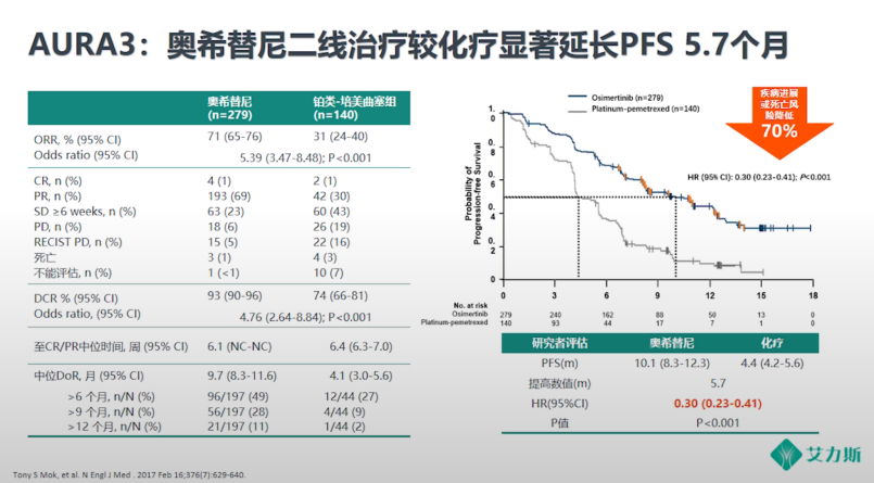 为了更好的克服耐药,三代EGFR TKI在保留不可逆结合特性的同时,将喹唑啉母环更换为嘧啶母环,增加对T790M抑制作用的同时增强了选择性。AURA3研究对一线EGFR治疗后耐药患者分别使用了奥希替尼和化疗,结果显示,奥希替尼较化疗可显著延长患者PFS(10.1个月vs 4.4个月)。针对亚裔人群使用奥希替尼二线治疗的AURA17研究PFS也达9.7个月,显示三代EGFR TKI能够更好地解决耐药问题。