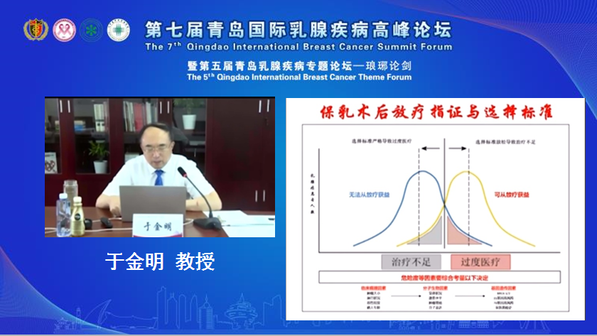 于院士对于临床常见的放疗争议问题给予了精准解答:(1)首先定义了乳腺癌术后放疗的绝对适应证、相对适应证及可以免除放疗的人群,放疗的绝对适应证:早期乳腺癌保乳术后及改良根治术后≥4腋窝淋巴结转移或T3-4患者;放疗的相对适应症:1-3个腋窝淋巴结转移者有改善趋势;免除放疗患者:≥70岁/T1N0/ER/PR(+),改良术后T1-2N0M0。(2)保乳术后放疗存在的争议问题:放疗可以提高局部控制率并能够有效地改善患者的生存趋势;大分割放疗与传统分割相比,疗效上无明显差别,并且具有方便、经济的优势;对于术后评估为低危的患者,可酌情行部分乳腺照射;对于高龄、低危、早期的保乳术后患者(≥70岁、激素受体阳性、腋窝淋巴结阴性、T1肿瘤并接受辅助内分泌治疗的患者),可考虑豁免放疗。(3)对于保乳术后区域淋巴结放疗,研究结果显示,SLNB 1-2个阳性的保乳手术患者术后可不照射腋窝;肿瘤高危患者可酌情考虑给予内乳淋巴结放疗;局部淋巴结放疗可以提高局部控制率,但对于是否能提高患者的总生存,目前尚有争议。对于瘤床加量的问题,于院士也进行了深入讨论,以往研究中发现,放疗瘤床加量可以提高局部控制率,但是不能改善患者的生存。年轻患者(<60岁)瘤床加量有显著的获益,但中重度瘤床纤维化风险增加,而老年患者(≥60岁)瘤床加量获益较少,并且可能导致严重瘤床纤维化风险的增加,所以,患者是否要进行瘤床加量需要根据患者的年龄和肿瘤危险程度分级确定。同时,于院士还提出,患者放疗还需要综合考量放疗的获益与心肺等放射损伤的不良影响。