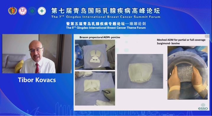 来自英国的Kovacs教授针对即刻乳房再造术,分享了目前国际重建技术的发展。Kovacs教授首先指出,联合补片与否并不影响手术相关并发症的发生。而放置在胸肌前与经典的放置在胸肌后相比,前者拥有相近的安全性,胸肌前可以降低坏死率、包膜挛缩发生、术后疼痛,而获得更高的患者满意度评分,并且更助于保存肩关节的功能。但是,目前仍需进一步更多的试验证实其优越性。此外,生物补片相较人工合成补片,可能会使胶原重建更加完整,新生血管生成,异体反应降到最小,但是尚无RCT研究,也缺乏明确的证据证实二者优劣,也无长期预后以及性价比的证据比较。最后教授通过多个试验总结,胸肌前植入物适用于BMI 20至35,乳房体积不大,无糖尿病等合并症,ASA评分1分,预测无需放疗,肿瘤可切除的患者。Kovacs教授通过大量手术操作和术后效果的图片分享,丰富了我们对乳房重建国际前沿技术认识和理解。
