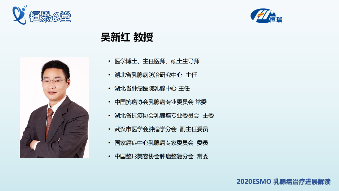 青山同路,与乳同行。2020年10月15日,来自全国各地专家再次齐聚“恒聚e堂”,共同参加由中国医学科学院肿瘤医院徐兵河教授担任大会主席的“2020ESMO乳腺癌治疗进展解读”专场,本期会议邀请了三位吡咯替尼研究的主要研究者河南省肿瘤医院刘真真教授,闫敏教授及四川大学华西医院罗婷教授讲述与解读卓越数据背后的故事,同时也邀请了中国医学科学院肿瘤医院王佳玉教授带我们一览2020年ESMO乳腺癌最新进展。会上齐聚各方观点,来自西安交通大学第一医院杨谨教授、山东大学齐鲁医院黎莉教授、中国医学大学附属第一医院石晶教授和湖南省肿瘤医院刘莉萍教授就会议相关的热点问题进行了深入的探讨,同时也带来了更多的思考。