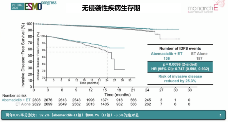 MonarchE研究证实,Abemaciclib联合内分泌治疗可显著延长高危HR+、HER2-早期乳腺癌患者的iDFS。HR=0.747(95% CI,0.598~0.932;P=0.0096),2年的iDFS有3.5%的绝对改善(92.2% vs 88.7%),2年的DRFS也有3.3%的绝对获益。尽管Abemaciclib带来了一些不良反应,但研究依然为临床实践提供了新的空间。