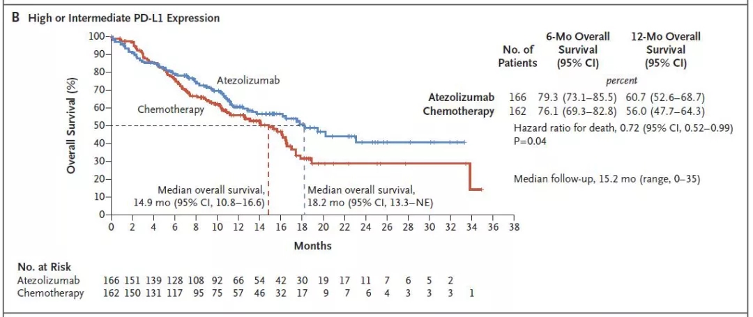 PD-L1中-高表达的患者,两组中位OS分别为18.2个月和14.9个月, P值未达到预设的显著性水准,研究为阴性结果(图3)。