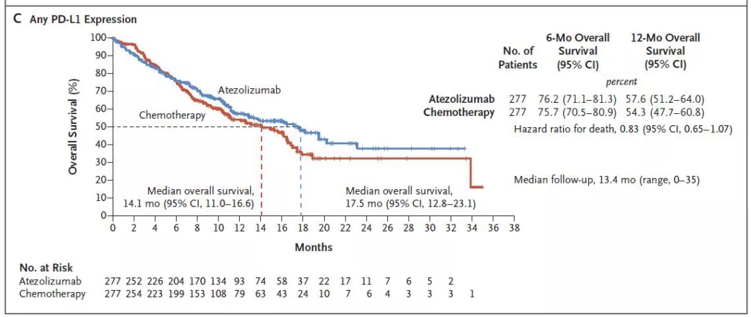 基于预设的统计分析计划,由于PD-L1中-高表达组为阴性结果,因此,该研究没有在PD-L1任意表达患者中进行正式的统计分析。这部分患者的中位OS分别为17.5个月和14.1个月(图4)。