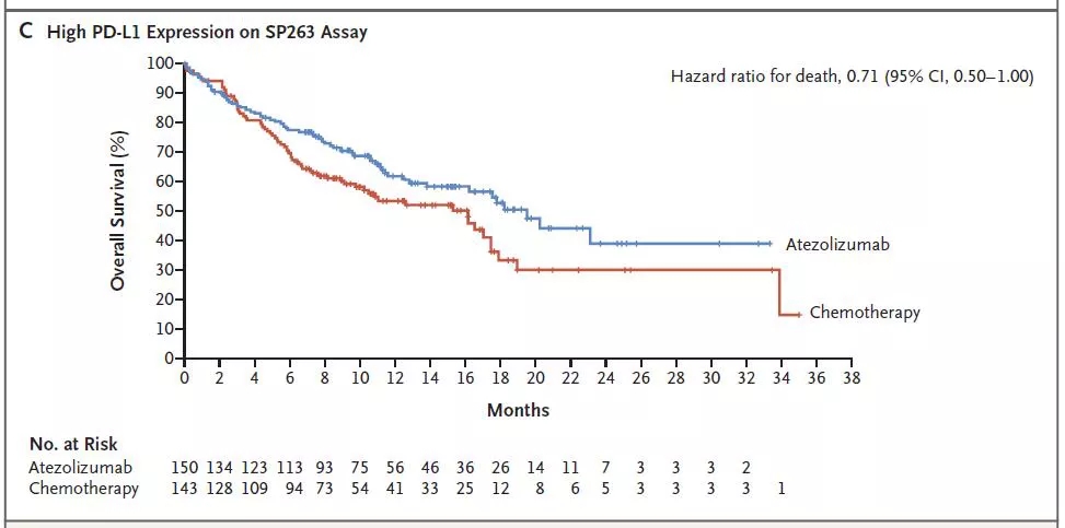 在驱动基因阴性且PD-L1高表达的患者中,研究者评估的ORR在免疫治疗组和化疗组分别为38.3%和28.6%,两组分别有68.3%和35.7%的出现客观响应的患者,数据截止时响应仍然持续;PD-L1中-高表达的患者,研究者评估的ORR分别为30.7%和32.1%,数据分析时,两组分别有70.6%和34.6%的出现响应的患者响应仍然持续;在PD-L1任意表达的患者,两组的ORR分别为29.2%和31.8%,数据分析时,两组分别有70.4%和33%的出现响应的患者响应仍然持续。
