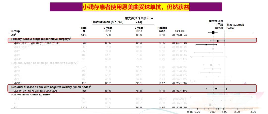 在2020 CSCO的乳腺癌指南中,HER2+乳腺癌的辅助治疗策略发生了改变,提出对于未达pCR患者,术前抗HER2治疗仅使用曲妥珠单抗者辅助治疗可考虑T-DM1(1B);而对于术前抗HER2使用双靶治疗未达pCR者,也可考虑T-DM1(1B)。这一指南的改变主要基于KATHERINE研究。KATHERINE研究结果显示,新辅助靶向治疗non-pCR患者辅助治疗应用T-DM1,可显著提高患者的iDFS。且无论激素受体状态、淋巴结状态、采用何种新辅助抗HER2方案,T-DM1各亚组iDFS均显示获益。而对于新辅助治疗后具有微小残留病灶的患者,T-DM1也能大幅降低患者的复发风险,这充分证明了T-DM1的优势。基于T-DM1存在的巨大优势,当前临床关注的另一个重要问题是针对临床确定non-pCR的患者,T-DM1使用时机是否可以前移?
