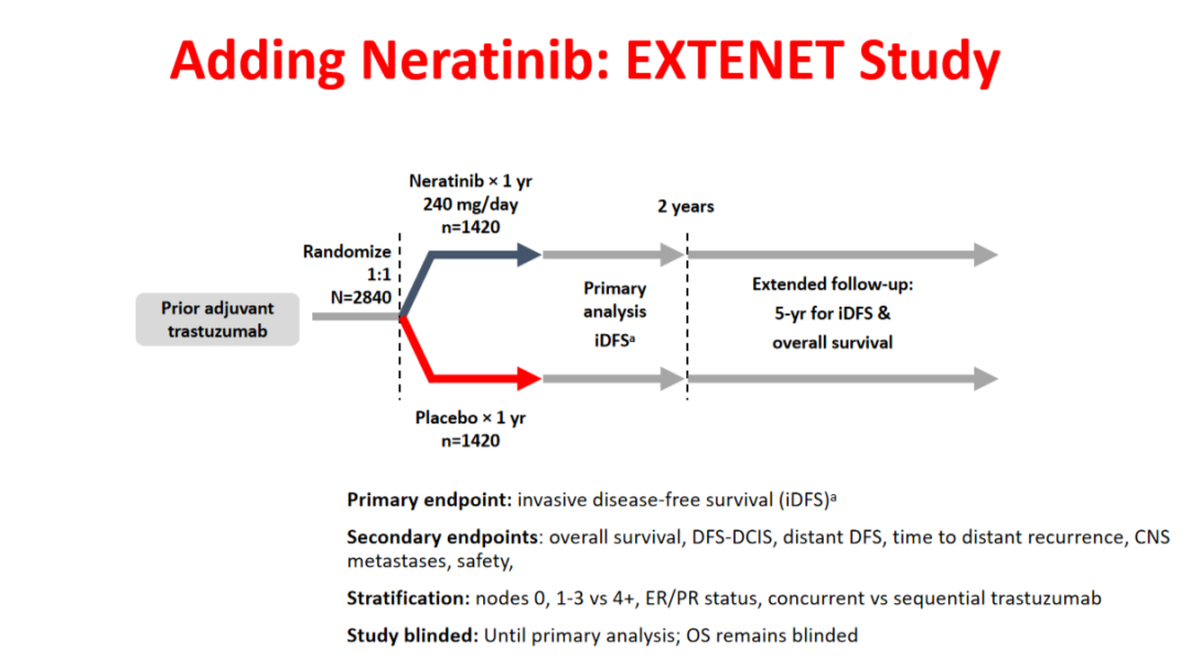 同时,在新辅助治疗后使用TKI的价值也得到了广泛关注。EXTENET研究探索了新辅助治疗后使用奈拉替尼对于iDFS的影响。5年随访中,奈拉替尼对于HR+的患者产生了极大的iDFS获益,但对于HR-患者则无明显效果;针对新辅助治疗后non-pCR的HR+患者,奈拉替尼同样显著提高了iDFS。目前尚在进行的HR-BLTN-III-EBC研究进一步考察了新辅助治疗24周后non-pCR患者使用TKI的获益情况。