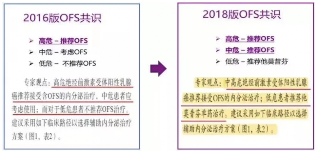 《中国早期乳腺癌卵巢功能抑制临床应用专家共识》(2016版)推荐高复发风险的绝经前激素受体阳性乳腺癌推荐接受含 OFS 的内分泌治疗,中危患者应考虑使用,而对于低危患者不推荐 OFS 治疗[1]。而2018版OFS共识[2]与2016版相比,将OFS的获益人群由高危和部分中危 “更新” 为中危和高危,强调了中危人群在OFS中的获益。这主要是基于2018年《新英格兰医学杂志》(N Engl J Med)发表的SOFT研究8年随访结果的更新。SOFT研究8年结果进一步证实了OFS使整体人群获益。