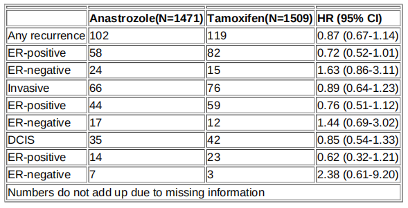 阿那曲唑对比他莫昔芬预防绝经后局部切除导管原位癌女性乳腺癌的12年结果。