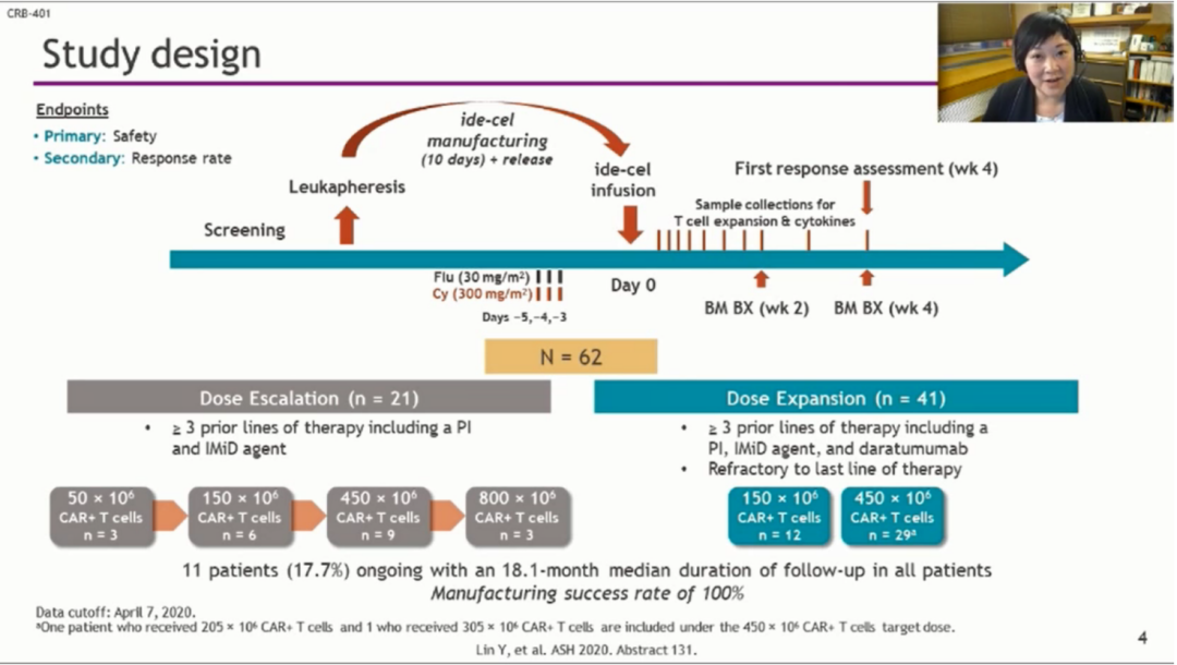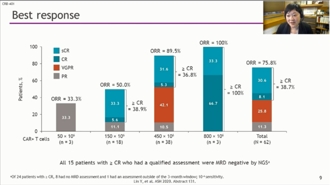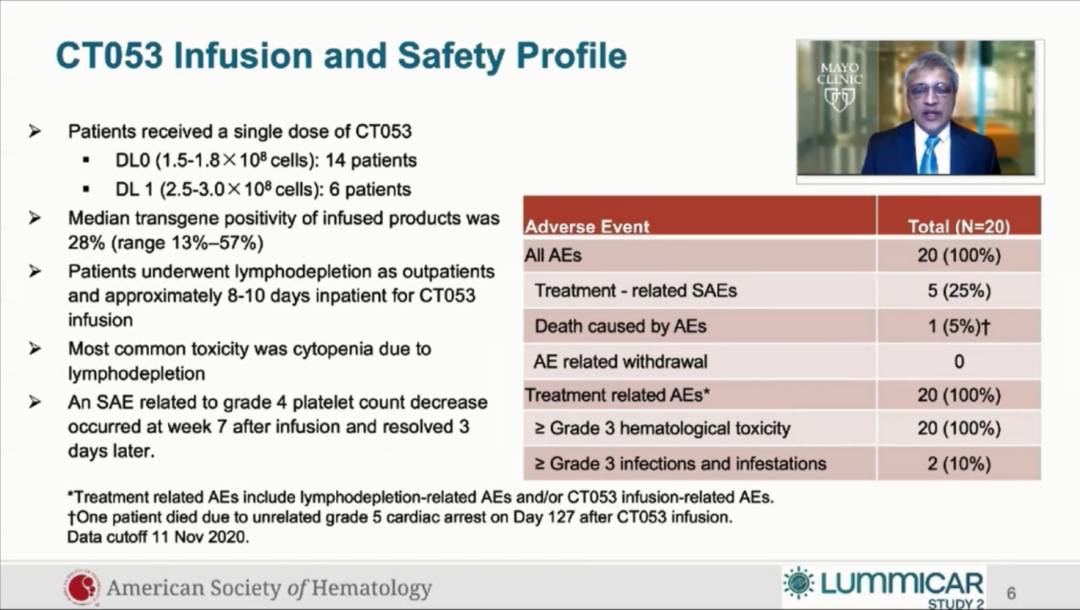 Kumar教授:该研究是一项1b/2期的临床试验,CT053是 CARsgen公司研发的一种靶向BCMA的CAR-T产品,本次ASH大会上有两项研究更新了CT053的研究数据,一项是在中国开展的 LUMMICAR-1研究(n=24),另一项则为美国开展的 LUMMICAR-2研究(n=20),这两项研究中CT053的总体缓解率(ORR)均达到了80%~90%。在 LUMMICAR-2研究中,18例患者可进行疗效评估,其中17例患者获得了治疗反应,10例达到了非常好的部分缓解(VGPR)以上的疗效,14例达到了微小残留病(MRD)阴性,截止目前,其疗效非常良好。在2期研究阶段,计划应用250~300×106/L CAR-T细胞进行治疗。在毒副作用方面,大部分患者出现了1-2级CRS,有1例患者发生了3级神经学毒性,但是总体上而言,其毒副作用均较容易处理。大部分的毒副作用为淋巴细胞衰减的血细胞减少,另外也有部分患者出现了迟发性血小板减少和中性粒细胞减少,我们认为这与CAR-T治疗本身有相关性。