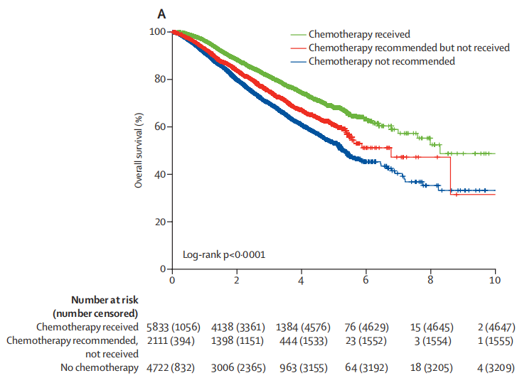 图2.接受化疗与推荐但未接受化疗的两组患者总生存率对比