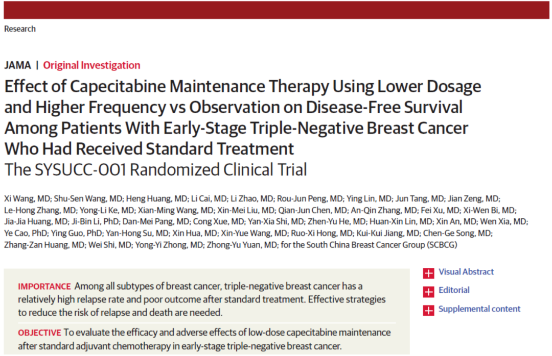 中山大学肿瘤防治中心团队开展的SYSUCC-001研究比较了早期TNBC标准治疗后使用低剂量、高频率卡培他滨节拍治疗对DFS的影响。结果显示与观察组相比,卡培他滨组显著提高5年的DFS率(83%vs73%,HR=0.64; 95%CI:0.42-0.95,p=0.03),各亚组的获益保持一致。这是世界上首个探索早期TNBC节拍化疗模式的研究,研究成果首次在2020 ASCO大会上以口头报告公开发布,并于2020年12月在国际顶尖医学期刊JAMA上重磅发表。