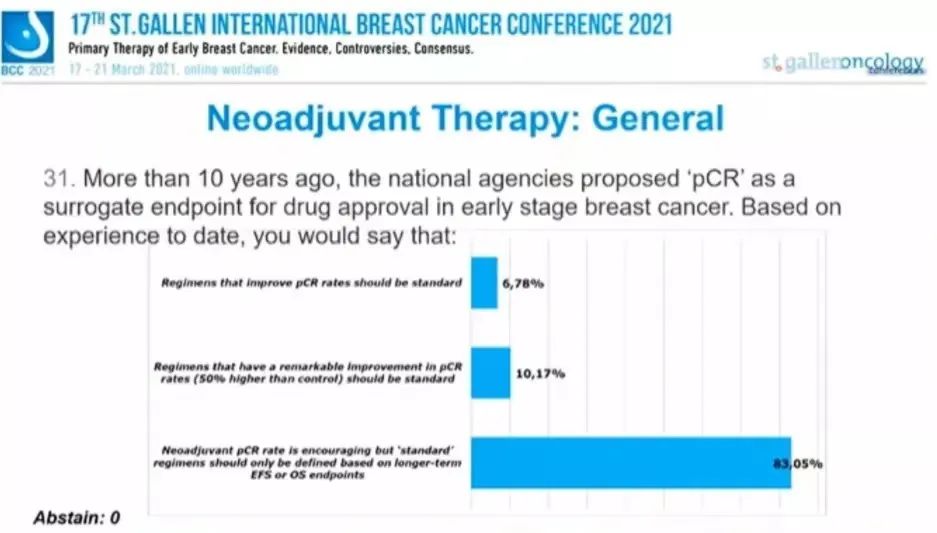 图1:6.78%的专家认为应该“将提高pCR率的方案作为标准”,10.17%的专家认为应该“将显著提高pCR(>50%)的方案作为标准”,83.05%的专家认为“新辅助治疗pCR率是令人鼓舞的,但标准方案应该基于更长期的EFS和OS终点来确定”。