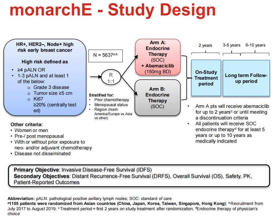 Monarch E研究将HR+/HER2-早期高复发风险的乳腺癌患者按照1:1比例随机分组为阿贝西利+辅助内分泌治疗和单纯内分泌治疗组,并按照是否进行了先前的治疗、月经状态和地区(北美、欧洲、亚洲或其他地区)进行分层。