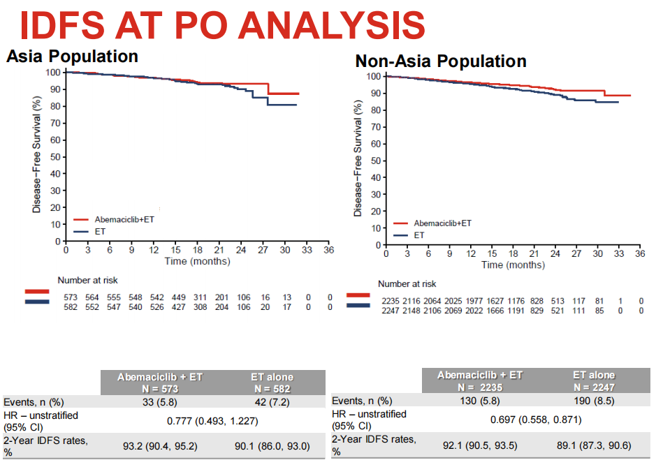 亚洲国家的乳腺癌患者与非亚洲国家的乳腺癌患者有不同的临床特征。既往monarch E研究数据显示,ITT人群中,阿贝西利联合内分泌治疗(ET)作为HR+/HER2-高危人群的辅助治疗,在早期乳腺癌无侵袭性疾病生存(iDFS)方面比单纯内分泌治疗有显著统计学意义的改善。