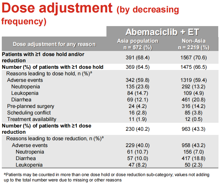 本次分析中,由于严重不良反应所导致的阿贝西利停药率为14.5%,在亚洲人群中,中性粒细胞减少和白细胞减少导致剂量保持和/或减少的发生率较高。在亚洲人群中大多数由AE引起的停药发生在治疗的前5个月内,大多数需要调整剂量的患者能够继续接受研究治疗。由于腹泻和疲劳引起的停药发生率较低,但由ALT、AST和中性粒细胞减少的停药率较高。