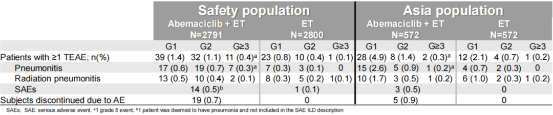 亚洲人群ILD发病率较高,亚洲人群ILD事件多为无症状(G1:4.9%)或有临床意义的AEs(G2)、SAEs,两组人群的中断情况相似。