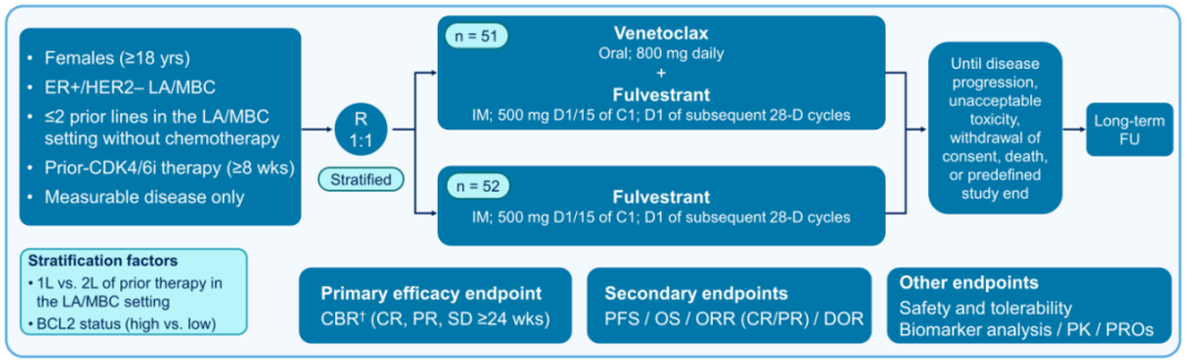 研究入组患者年龄≥18岁女性,针对既往接受过CDK4/6抑制剂、≤2线内分泌治疗且未接受过化疗的ER+/HER2-晚期乳腺癌。患者1:1随机分为VEN(口服,800 mg每日)+ FUL组或FUL单药组,治疗至疾病进展、不可耐受的毒性、撤回知情同意、死亡或定义的研究终止。患者根据既往治疗线数(1线 vs 2线)和BCL2状态(high vs low)进行分层。主要研究终点为临床获益率(CBR),次要终点为无进展生存期(PFS)和总生存期(OS),同时进行安全性和亚组分析。