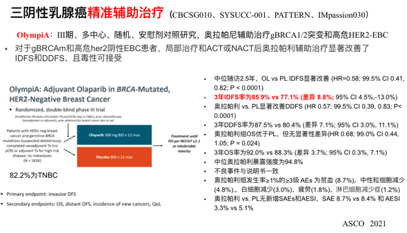 今年ASCO报道的OlympiA研究,对于gBRCAm和高危HER2阴性EBC患者,在局部治疗ACT或NACT后奥拉帕利辅助治疗显著改善了IDFS和DDFS,3年IDFS率为85.9% vs 77.1% (差异8.8 %),且毒性耐受。奥拉帕利维持治疗开创了新的三阴性乳腺癌辅助治疗方法,但局限于gBRCAm人群,亚组分析显示,之前未用过铂类药物可能获益显著。