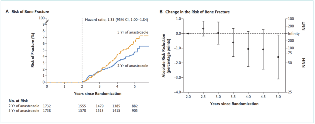 该研究结果表明,对于完成术后5年内分泌治疗的绝经后HR阳性早期乳腺癌患者,延长阿那曲唑延长5年与延长2年相比,获益相似,但骨折风险增加。