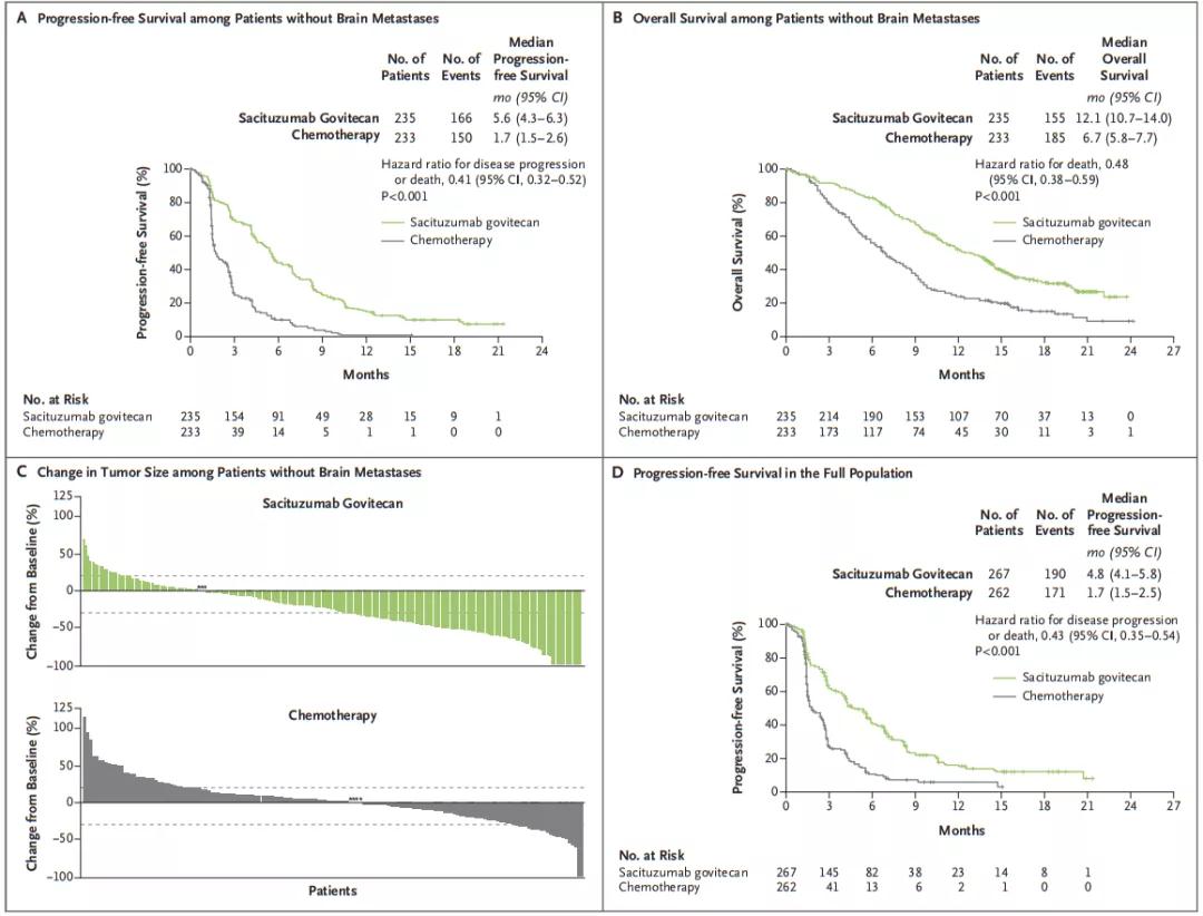 2021年发表于NEJM中位随访17个月的结果显示,相较于化疗组,戈沙妥珠单抗组的疾病进展或死亡风险显著降低59%(mPFS:5.6 vs 1.7个月,HR 0.41,95%CI:0.32~0.52),死亡风险显著降低52%(mOS:12.1 vs 6.7个月,HR 0.48,95%CI:0.38~0.59),戈沙妥珠单抗组的ORR则是化疗组的7倍之多(35% vs 5%)