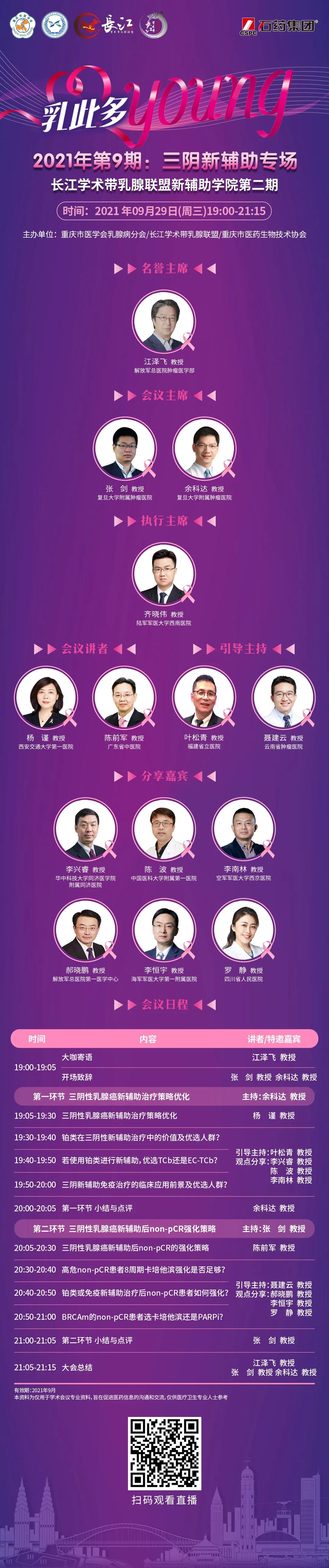 编者按:由重庆市医学会乳腺病分会、长江学术带乳腺联盟、重庆市医药生物技术协会联合主办的乳此多YOUNG第九期暨长江学术带乳腺联盟新辅助学院第二期。本次大会由江泽飞教授担任会议名誉主席,张剑教授、余科达教授将做为大会主席发表致辞并主持会议,齐晓伟教授将担任本次会议执行主席。