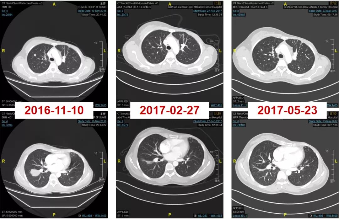 2016-06-01复查CT:右肺下叶上段团块状肿物(图1),考虑转移。