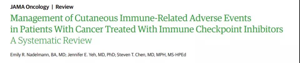 [2]Nadelmann ER, Yeh JE, Chen ST. Management of Cutaneous Immune-Related Adverse Events in Patients With Cancer Treated With Immune Checkpoint Inhibitors: A Systematic Review [published online ahead of print, 2021 Oct 28]. JAMA Oncol. 2021;10.1001/jamaoncol.2021.4318. doi:10.1001/jamaoncol.2021.4318