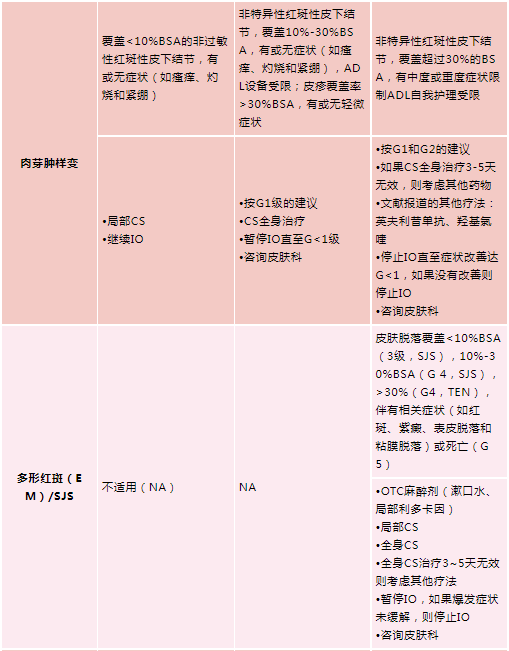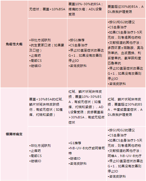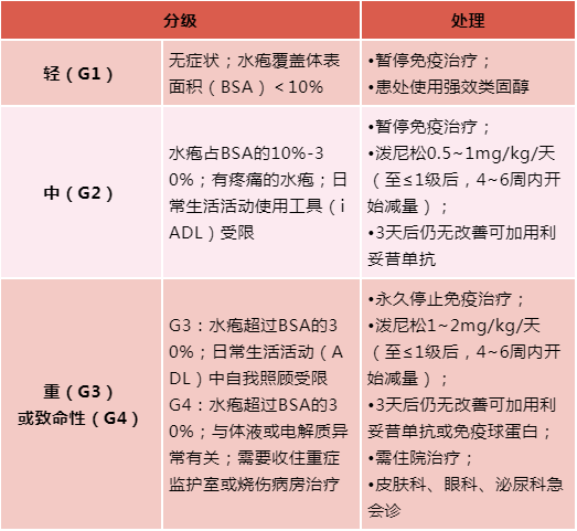 根据不同的大疱性皮炎cirAEs分级(轻、中、重度/致命性),可给予以下不同的处理。