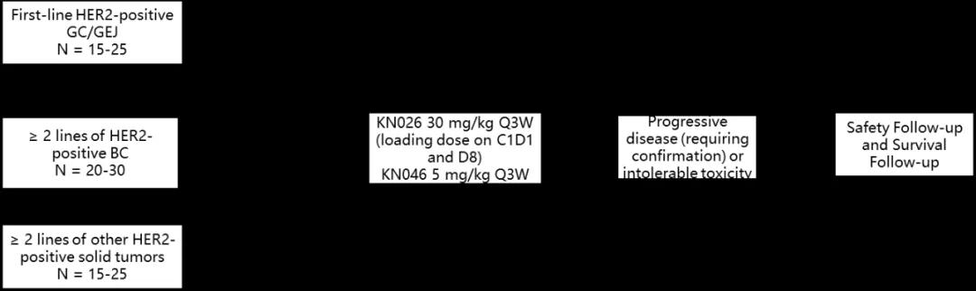 入选既往接受过至少一种抗HER2靶向联合化疗或T-DM1治疗的转移性HER2阳性乳腺癌患者,接受KN046(5 mg/kg Q3W)联合KN026(30 mg/kg Q3W)药物治疗,直至疾病进展、出现不可接受的毒性或患者要求退出。本临床试验的主要研究终点是ORR。