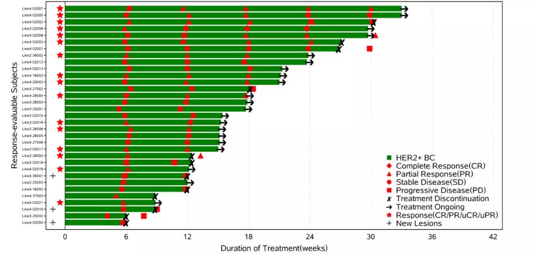 在这里,我们报告了一项正在进行的单臂多中心Ⅱ期临床试验的初步结果,该试验评估了 KN046与KN026联合治疗既往抗HER2联合化疗或TDM1治疗后进展的HER2阳性转移性乳腺癌患者的有效性及安全性。我们发现KN046联合KN026方案在至少接受过一种HER2靶向联合治疗的转移性HER2阳性乳腺癌女性患者中,截止目前获得了48.5%的ORR,并且入组患者很多是包含TKI或T-DM1多线治疗失败的患者,约40%是既往经过3线或以上治疗的,也获得了不错的疗效。