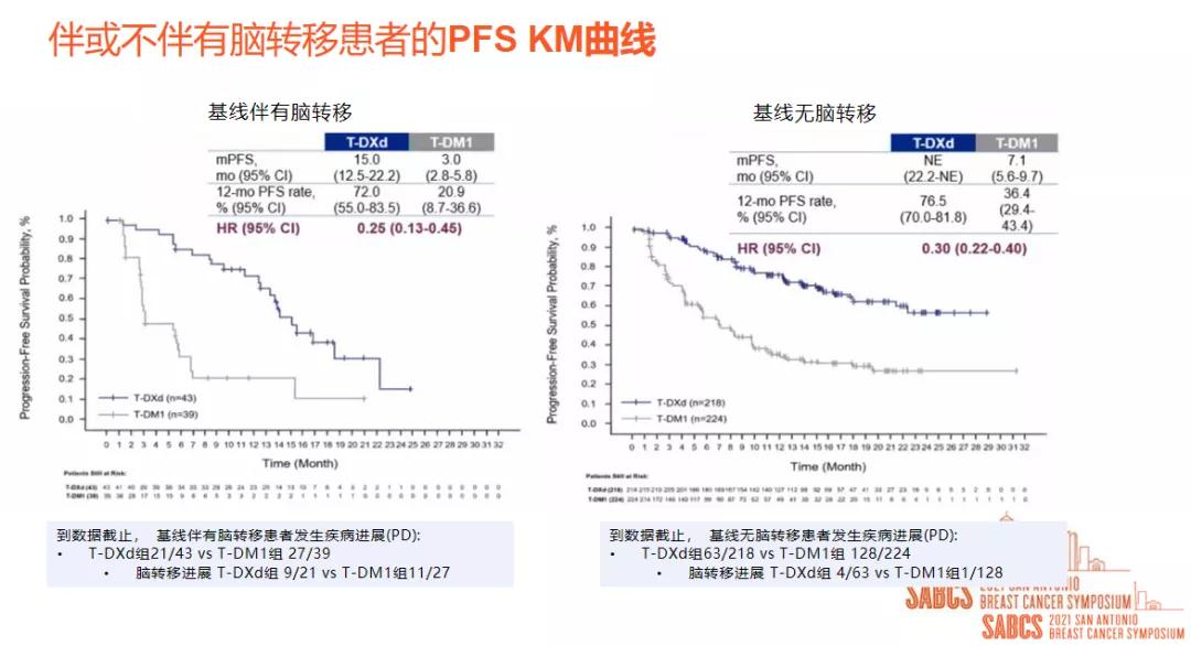 其中,基线伴脑转移(HR 0.25)和无脑转移患者(HR 0.30)的疾病复发和死亡风险分别降低75%和70%;ORR也分别达到了67.4%和82.1%(高于T-DM1组的20.5%和36.6%),显示了T-DXd在脑转移(BM)患者中的良好疗效。