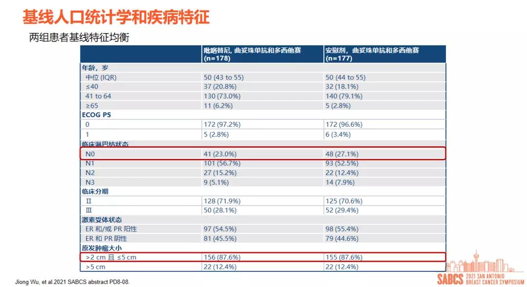 PHEDRA研究是一项旨在评估吡咯替尼或安慰剂+曲妥珠单抗+多西他赛用于HER2阳性乳腺癌新辅助治疗的Ⅲ期试验。研究设计及患者基线特征如下图所示。